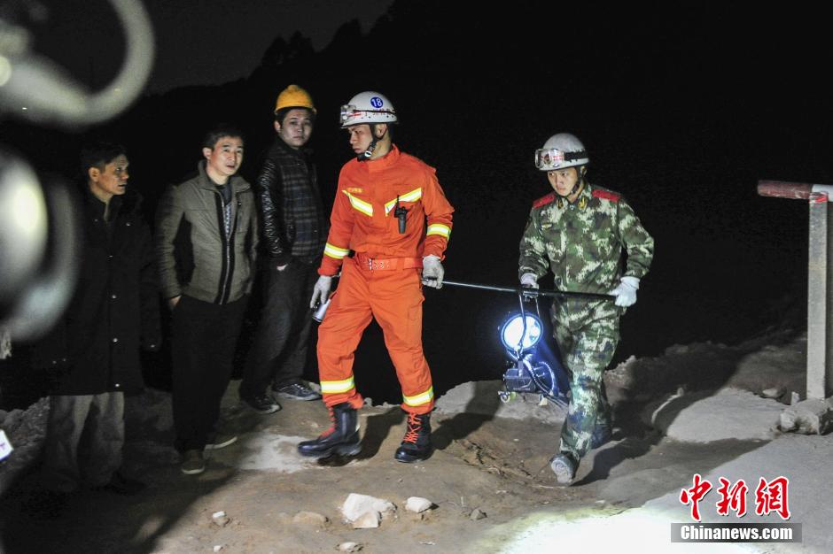 12月29日,医护人员运送救援设备。当日下午4时,广州市萝岗区凤凰山隧道工程TJ-04标牛鼻山隧道口前的一段防护坡发生坍塌,5名在防护坡上修建水泥竖井的工人被埋。截至30日凌晨1时,被困工人仍未救出。 中新社发 陈骥旻 摄