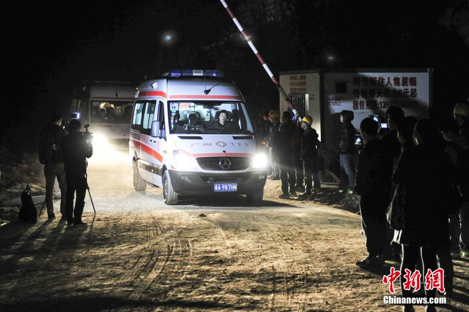12月29日,医护人员运送救援设备。当日下午4时,广州市萝岗区凤凰山隧道工程TJ-04标牛鼻山隧道口前的一段防护坡发生坍塌,5名在防护坡上修建水泥竖井的工人被埋。截至30日凌晨1时,被困工人仍未救出。 中新社发 陈骥旻 摄