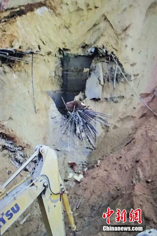 12月29日,防护坡上的水泥井因山泥倾泻被埋。当日下午4时,广州市萝岗区凤凰山隧道工程TJ-04标牛鼻山隧道口前的一段防护坡发生坍塌,5名在防护坡上修建水泥竖井的工人被埋。截至30日凌晨1时,被困工人仍未救出。 中新社发 钟欣 摄