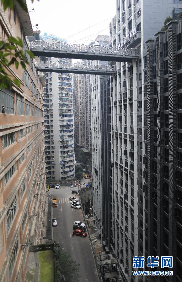 图为重庆市渝中区临江门附近两座高空天桥(12月30日摄)。近日,位于重庆市渝中区的两座高空人行天桥再次引发网友热议。该天桥为钢结构斜拉桥,一端连接奎星楼广场,另一端连接嘉滨路118号高盛创富中心B栋22楼,距地面最大高度65.8米,长23米,宽4米。据项目施工方介绍,天桥于6月份建好,使用350吨起吊机吊装完成,其中一座于12月初开放通行。 新华社记者 孟涛摄