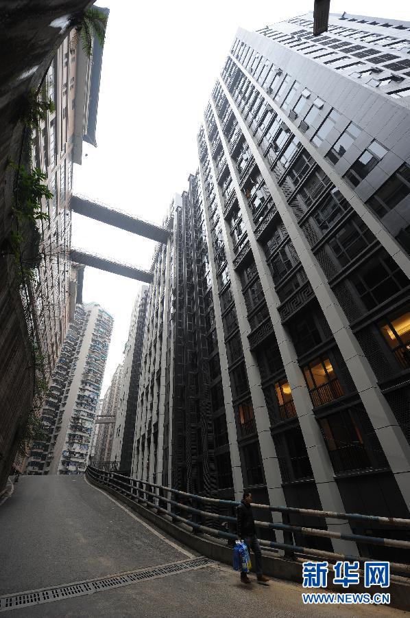 12月30日,行人从重庆市渝中区临江门附近两座高空天桥下走过。近日,位于重庆市渝中区的两座高空人行天桥再次引发网友热议。该天桥为钢结构斜拉桥,一端连接奎星楼广场,另一端连接嘉滨路118号高盛创富中心B栋22楼,距地面最大高度65.8米,长23米,宽4米。据项目施工方介绍,天桥于6月份建好,使用350吨起吊机吊装完成,其中一座于12月初开放通行。 新华社记者 唐奕 摄