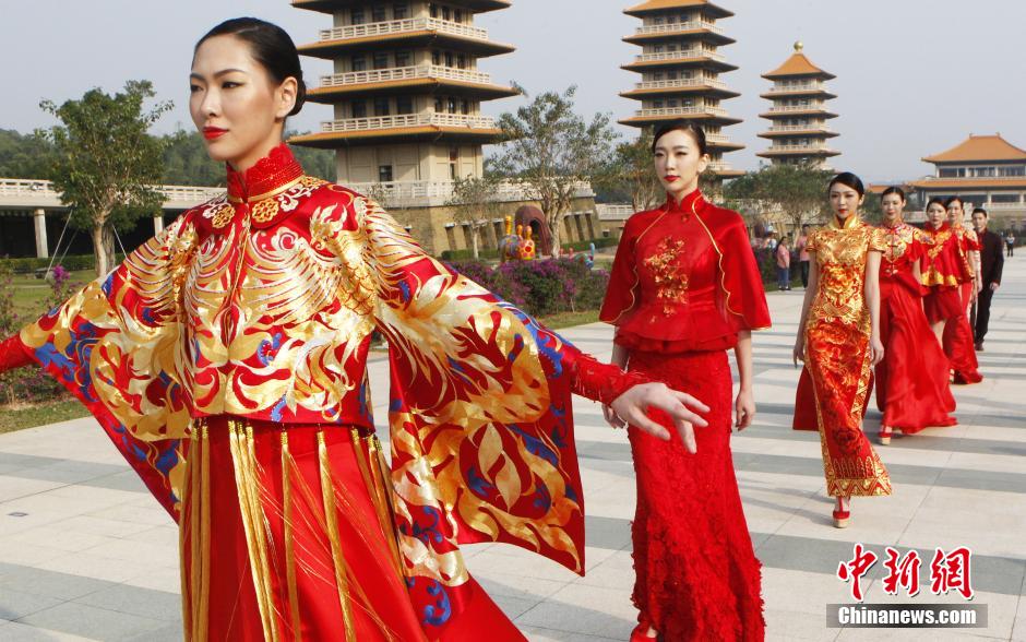 12月30日, 中国婚礼服展暨2015佛光山佛化婚礼启幕仪式在台湾高雄佛光山佛陀纪念馆启幕,“锦绣华夏、礼传天下”。是次活动主题为佛化婚礼、华美之喜,包括中华婚礼服文化静态展以及千人国际佛化婚礼等。图为台湾模特佛光山纪念馆上演精彩华服秀。 中新社发 钱兴强 摄