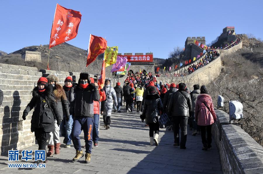 1月1日,中外游客在新年第一天攀登长城。当日,2015全国新年登高健身活动在国内22个省市区同时开展,2022名北京市民以及众多国内外游客在北京延庆县八达岭长城参加主会场的徒步攀登长城活动,助力北京和张家口申办2022年冬奥会。新华社记者李欣摄