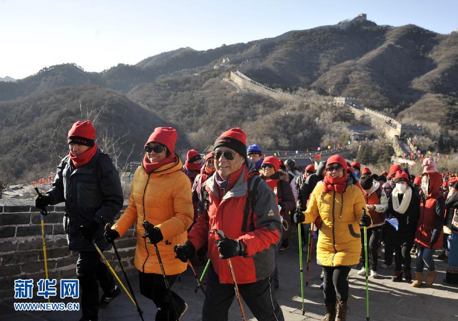1月1日,北京中老市民参加徒步攀登长城活动。当日,2015全国新年登高健身活动在国内22个省市区同时开展,2022名北京市民以及众多国内外游客在北京延庆县八达岭长城参加主会场的徒步攀登长城活动,助力北京和张家口申办2022年冬奥会。新华社记者李欣摄