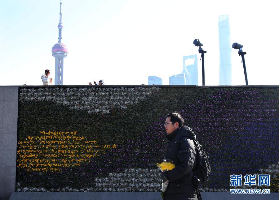 2015年1月1日,一名市民手持鲜花走过上海外滩。当日上午,有上海市民到外滩陈毅广场献花,祭奠踩踏事故中的遇难者。新华社记者刘颖摄