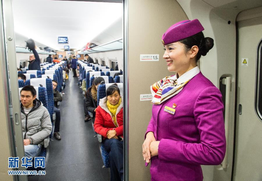 2015年1月1日,重庆客运段的乘务员在首趟重庆至北京高铁动车车门内迎接旅客登车。当日早上7时58分,重庆至北京的首趟高铁动车G310次由重庆火车北站发出,预计当晚20时20分抵达北京。这趟高铁动车组全列编组16辆,定员1061人,将经由渝利线、宜万线、汉宜线、京广高铁运行,横跨三省两市,沿途停靠汉口、郑州、石家庄等站。列车全程运行时间12.5小时,将实现重庆至北京朝发夕至。新华社记者 刘潺 摄