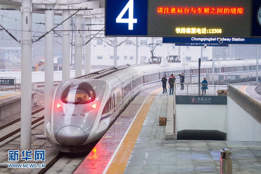 2015年1月1日,重庆开行的首趟至北京的高铁动车G310次从重庆火车北站发出。当日早上7时58分,重庆至北京的首趟高铁动车G310次由重庆火车北站发出,预计当晚20时20分抵达北京。这趟高铁动车组全列编组16辆,定员1061人,将经由渝利线、宜万线、汉宜线、京广高铁运行,横跨三省两市,沿途停靠汉口、郑州、石家庄等站。列车全程运行时间12.5小时,将实现重庆至北京朝发夕至。新华社记者 刘潺 摄