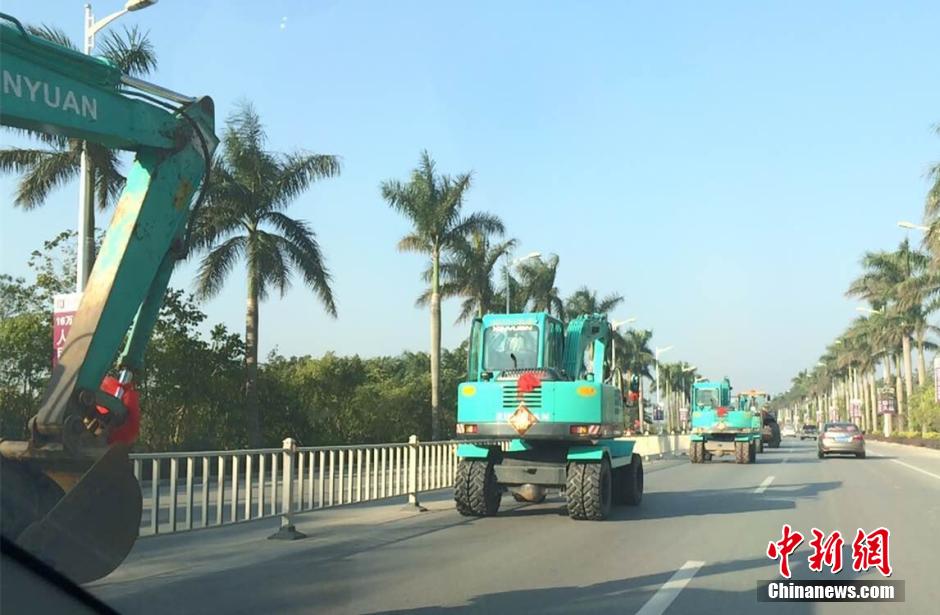 1月1日上午,广西钦州市金海湾大道,由几辆大型挖掘机组成的迎亲队在霸气巡街。杨思骋 摄
