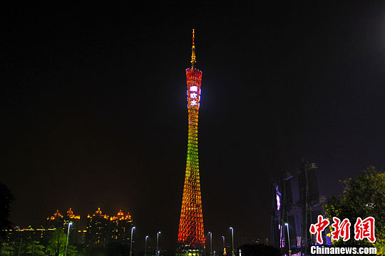12月30日,广州塔塔身出现“广州唔吹水”五个大字吸引市民关注。中新社发 陈骥旻 摄