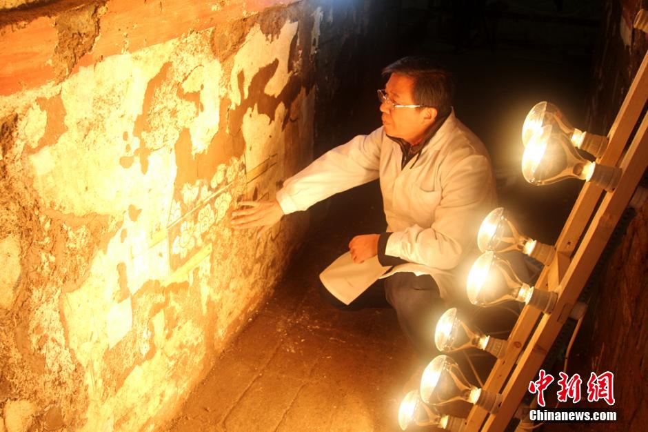 12月30日,考古人员对西安唐代宰相韩休墓甬道的壁画进行揭取保护。陕西历史博物馆壁画保护修复研究中心副主任杨文宗介绍,墓葬壁画因会受到侵蚀、剥落、病害等影响,保护难度很大。考古人员对韩休墓甬道壁画进行了清洗加固,空鼓回贴等大量准备工作后,开始对甬道的壁画先行揭取,以最大限度保护壁画。2014年,考古人员在位于西安市长安区的唐代韩休夫妻合葬墓,发现了清晰可见的精美壁画。墓室北壁东侧的山水画,是目前考古发现的唐代最早的独屏山水画,弥补了壁画发展史,将中国山水画的成熟期提前至唐代。田进 摄
