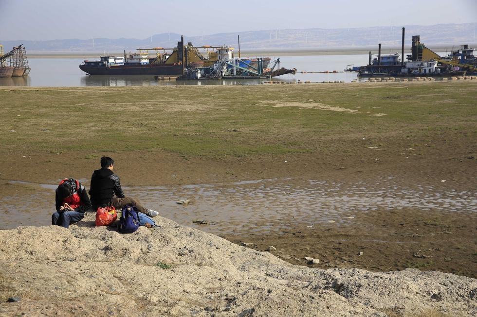 2015年1月3日,江西省九江市星子县,受上游来水减少和久旱少雨的影响,我国第一大淡水湖鄱阳湖逼近极枯水位,江西省星子县标志性景观落星墩“水落石出”,丰水期需要渡船才能前往观景台,现在步行就可以到达,吸引了游人们去游玩。