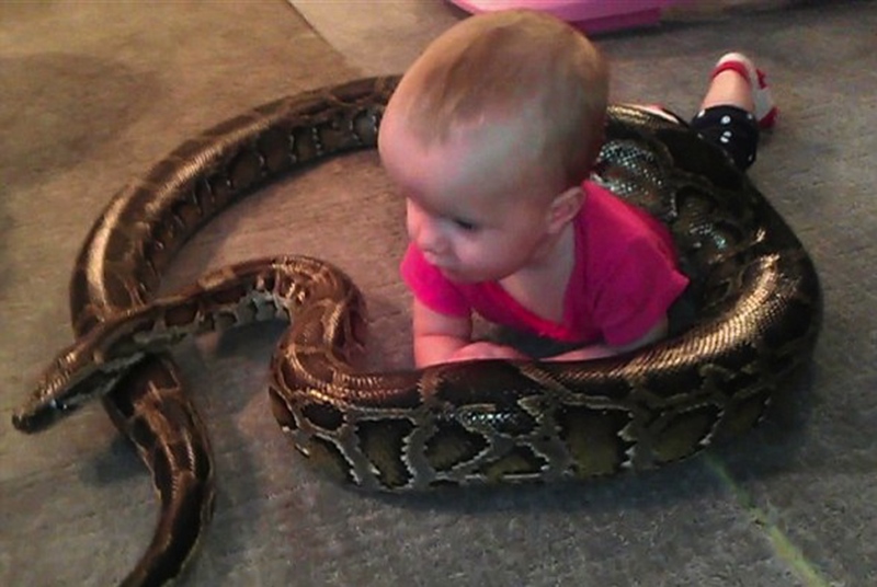 人民网1月3日电 美国底特律有个男子“爱蛇如命”,不但在家里饲养着30多条各种蛇类与其它爬行动物,甚至还让一条四米多长的缅甸巨蟒来看护自己年仅1岁多的幼儿。从其拍摄的视频看,蟒蛇在孩子周围游走,但并没伤害小姑娘一根毫毛。
