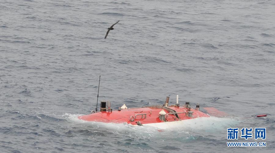 浮出水面的“蛟龙”号载人潜水器(1月3日摄)。目前,中国载人潜水器“蛟龙”号正在西南印度洋执行2014-2015年试验性应用航次第二、三航段科考任务。每次“蛟龙”号下潜从布放至回收,母船科考队员都得时刻关注下潜人员和潜水器状态。很多科考队员也都守望在甲板上,等待“蛟龙”号下潜队员平安归来。新华社记者张旭东摄
