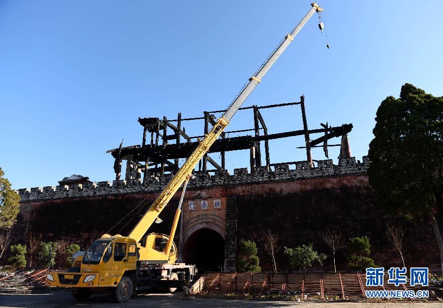 1月3日,一台工程机械在被火灾烧毁的云南巍山古城拱辰楼前施工。