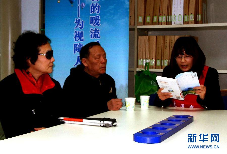 北京市西城区第一图书馆视障人阅览室内,一位志愿者(右一)在为视障读者提供语音阅读志愿服务(2014年12月20日摄)。幼年因病致盲的杨平记如今在北京一家盲人按摩所工作,每逢周末或休息日,他经常来到北京市西城区第一图书馆(“西图”),这里的视障人阅览室各种盲文书籍种类丰富,让他感受到阅读带来的快乐。 “西图”视障人阅览室于2001年建立。10余年来,这里引入了盲人阅读电子点读器和助视器等设备,帮助盲人更好地使用互联网功能;订阅了大量的盲人电子期刊,可以让盲人下载后放入电脑触摸以方便阅读。随着许多高科技设备的投入使用,“西图”也相应开展了针对视障人士的电脑技术及其他各类培训班,义务为他们培训和提高使用先进设备的技能。不仅如此,图书馆还增加了海量的语音服务,从最早的磁带到现在的电子书,再到志愿者的语音朗读服务,这里致力于让视障人士在这里享有一个良好的环境。目前,“西图”视障人阅览室自采馆藏的盲文图书超过400多册。鉴于盲文图书的出版周期相对较长、采购成本较高,“西图”还与中国盲人图书馆建立了合作“换阅”机制,以节约成本、提高效率。杨平记说,他很珍惜这里舒适的阅读学习环境,让他可以像身体健全的人一样参与到社会中来,与平常人一道读书学习。 新华社记者 潘旭 摄