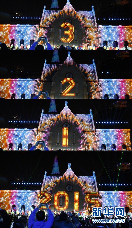 这张拼版照片显示,在上海外滩源举办的跨年灯光秀表演中,2015年1月1日零点的倒计时。 当日,以“梦圆中国活力上海”为主题的上海2014—2015跨年灯光秀活动在外滩源文化广场举行,迎接2015年到来。 新华社记者 方喆 摄
