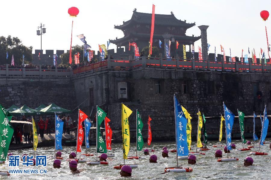 2015年1月1日,湖北襄阳举行汉水流域冬泳文化节,来自各地的冬泳爱好者在襄阳畅游汉江,欢庆新年。 新华社发(王虎 摄)