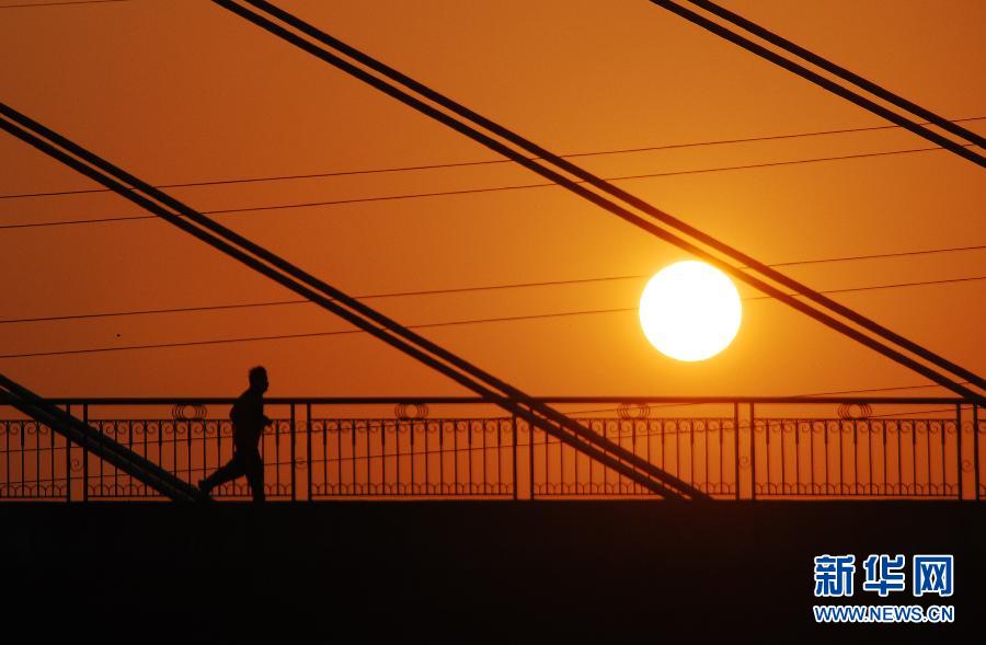 2015年1月1日,新年第一天,旭日东升。在广西贺州市灵峰大桥上,一名男子在朝阳下晨练。 新华社发(廖祖平 摄)