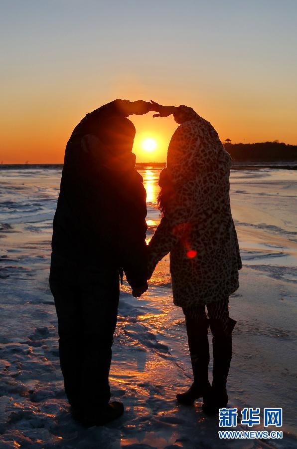 2015年1月1日,新年第一天,旭日东升。这是两位年轻人在河北省秦皇岛市海边观看日出。 新华社记者杨世尧摄