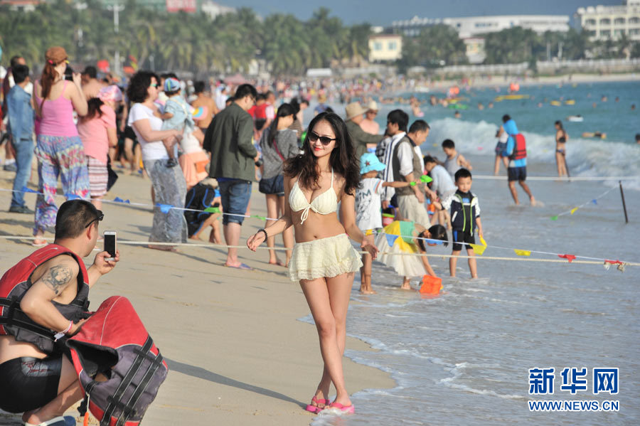 1月2日,在三亚大东海景区,游客在海边拍照留念。当日是元旦小长假的第二天,许多游客来到海南省三亚大东海景区戏水。 新华社发(杨冠宇 摄)