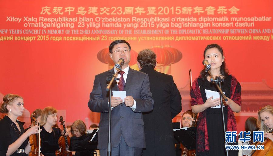 当晚,中国驻乌兹别克斯坦使馆在塔什干洲际酒店举行庆祝中乌建交23周年暨2015新年音乐会,乌兹别克斯坦交响乐团的艺术家们与中国驻乌使馆外交官同台献艺。新华社记者沙达提摄
