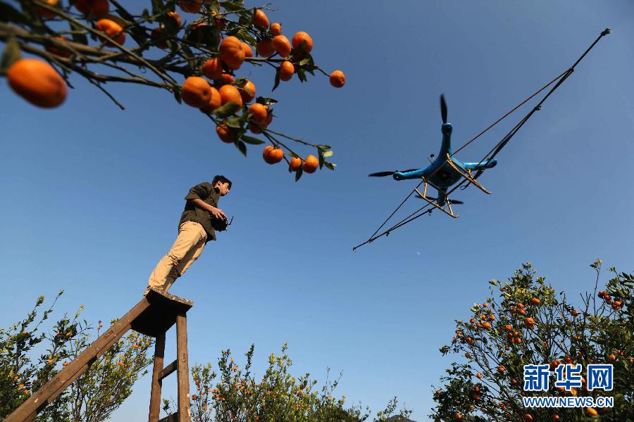 1月2日,在广西永福县百寿镇,技术人员利用无人飞机喷农药。元旦期间,广西永福县出资200多万元,对县里三大农产业之一、约20万亩的富硒砂糖橘进行无人飞机喷药灭虫。 新华社发(刘教清 摄)