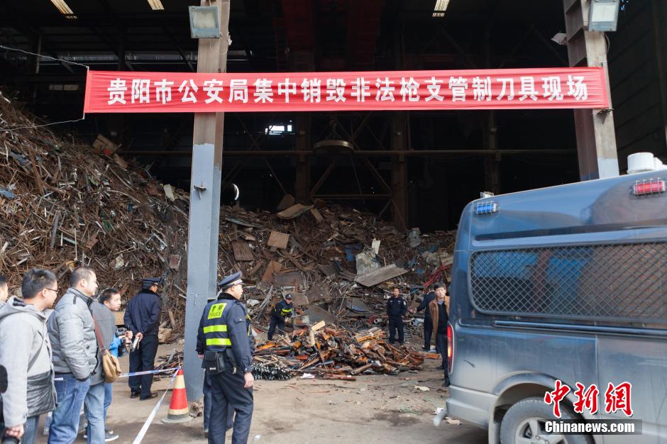 12月30日中午,贵阳警方在花溪的一个钢材市场对收缴的非法枪支、管制器具进行集中销毁,共销毁非法枪支2830支、管制刀具12962把。中新社发 贺俊怡 摄