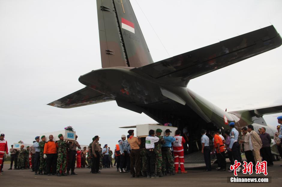 1月2日傍晚,设在印尼庞卡兰布翁的搜救中心将打捞起来的亚航失事10具遇难者遗体用军用飞机运往泗水,并作进一步的法医鉴定识别。印尼当天共出动了17架飞机、29艘船只和57人组成的海军蛙人部队前往失事海域搜救。截止2日,印尼共打捞出失事亚航飞机上22具遇难者遗体。顾时宏 摄