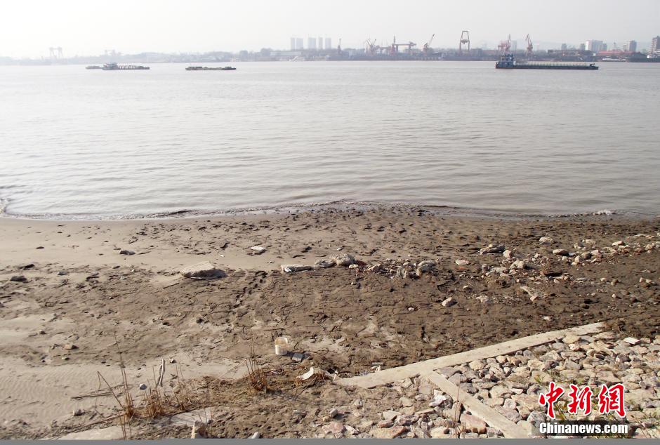2015年1月4日,正处枯水期的长江江苏南京段水位低迷,部分船只搁浅在裸露的将摊上。据悉,自11月下旬以来,长江中下游水位持续走低,长江干线全面进入冬季枯水期。图为2015年1月4日,江苏南京,枯水期的长江岸滩大面积裸露。 中新社发 安东 摄 图片来源:CNSPHOTO