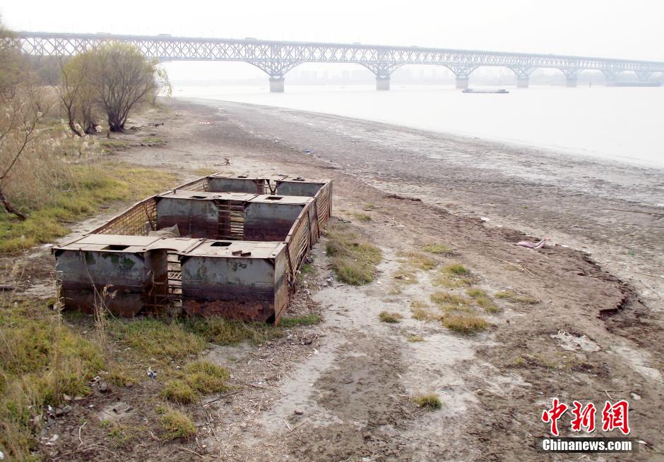 2015年1月4日,正处枯水期的长江江苏南京段水位低迷,部分船只搁浅在裸露的将摊上。据悉,自11月下旬以来,长江中下游水位持续走低,长江干线全面进入冬季枯水期。图为2015年1月4日,江苏南京,一艘铁壳船搁浅在枯水期的长江岸滩。 中新社发 安东 摄 图片来源:CNSPHOTO