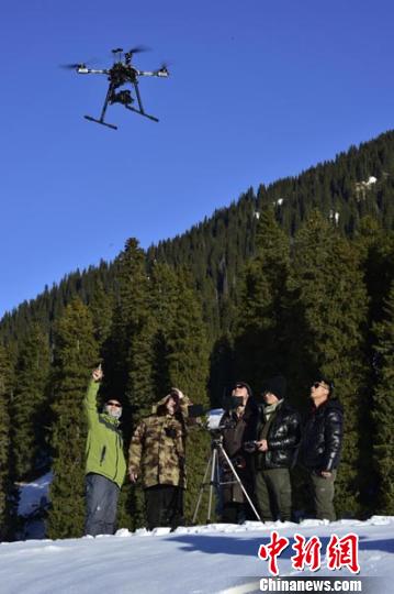 1月1日,在新疆和静县巩乃斯风景区,航拍爱好者在航拍冬季风景。 确·胡热 摄