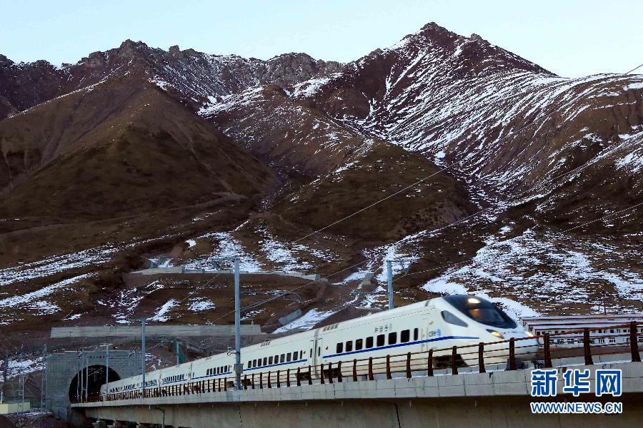 2014年12月4日,一列兰新高铁测试动车在海拔约3600米的甘肃和青海交界的祁连山腹地疾驰。古代海陆丝绸之路曾是中国联系东西方的“国道”,是中国、印度、希腊三种主要文化交汇的桥梁;今天,丝绸之路重焕活力,成为新形势下中国对外开放重要战略布局。2015年,“一带一路”将继续延展铺开,从顶层战略构想步入务实合作阶段。新华社发