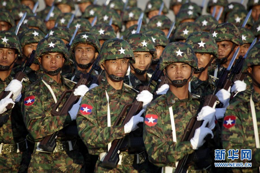 1月4日,在缅甸内比都,缅甸士兵参加阅兵仪式。为了庆祝缅甸独立67周年,缅甸当日恢复举行停办数十年的独立节阅兵和群众游行仪式。 新华社发(吴昂摄)