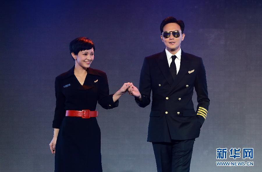 1月4日,主演郭采洁(左)与张智霖在发布会上互动。当日,电影版《冲上云霄》在北京举行“起航”发布会,导演叶伟信、监制梁家树携主演吴镇宇、古天乐、张智霖、郑秀文、佘诗曼、郭采洁出席宣传,电影预计于2月19日大年初一上映。新华社发(郑凯元 摄)