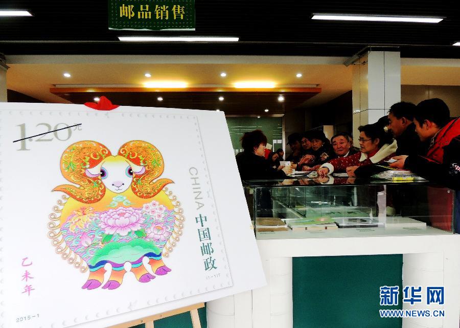 当日,中国邮政发行《乙未年》特种邮票1套1枚,全套邮票面值为1.20元。该套邮票是中国邮政发行的第三轮生肖邮票的收官之作。该套邮票由吴冠英设计,邮票以绵羊作为造型基础,羊角装饰有缠枝花草纹,羊身上为牡丹、莲花等花卉图案,并伴以祥云、水波纹,整个画面蕴含着吉祥、圆满和幸福绵长的寓意,寄托了对新的一年的美好祈盼。邮票图案中的牡丹花为三层,两侧为12卷毛,寓意我国生肖邮票发行三轮,每轮12套邮票。新华社发(耿玉和 摄)