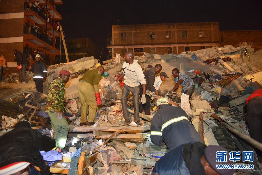 1月4日,在肯尼亚首都内罗毕,救援人员在坍塌的住宅楼废墟上搜寻幸存者。当日,肯尼亚首都内罗毕的一栋住宅楼发生倒塌事故,造成至少十余人受伤,被埋人数不明。 新华社/美联