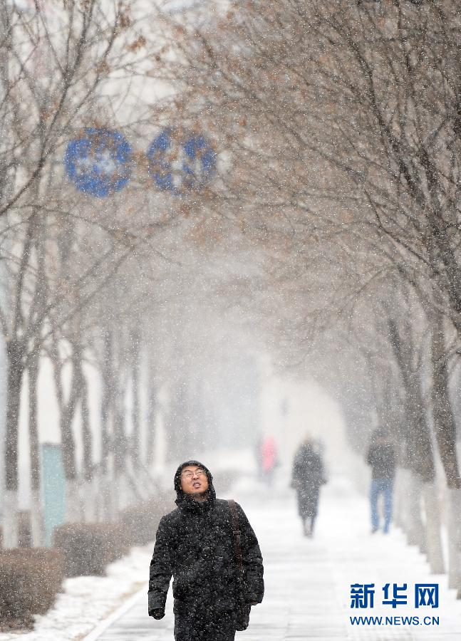 1月5日,市民行走在雪中的沈阳街头。当日,辽宁省沈阳市迎来一轮降雪天气,沈阳市气象局发布寒潮蓝色预警,预计雪后最低气温下降8℃到10℃。 新华社记者姚剑锋摄