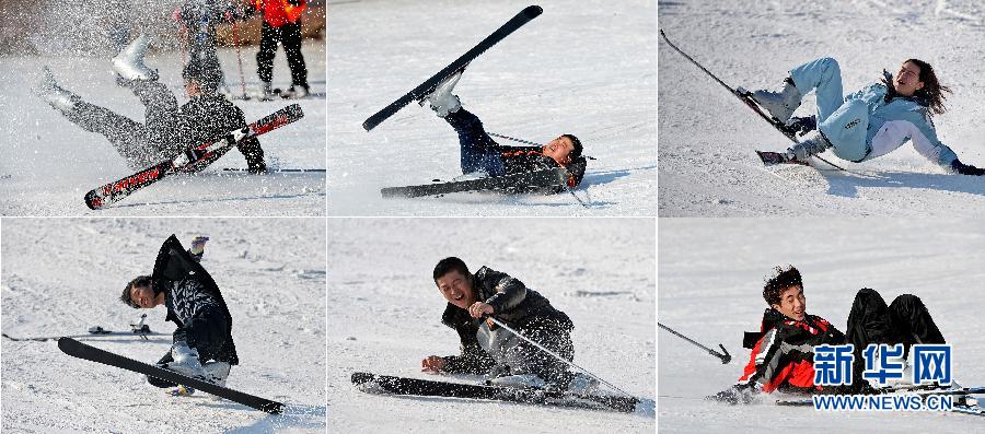 在银川鸣翠湖四季滑雪场,初学滑雪的游客在“摔打”中体验滑雪带来的快乐(拼版照片,1月3日摄)。进入冬季以来,宁夏银川多个景区纷纷推出冬季冰雪旅游体验项目,吸引众多市民和游客来到雪地“撒欢”,感受冰雪带来的速度与激情。 新华社记者王鹏 摄