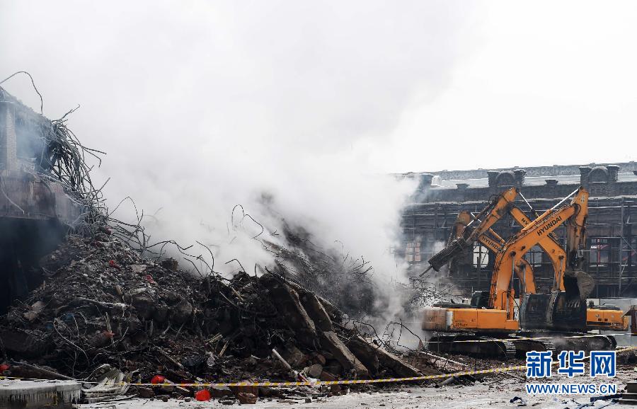 1月4日,大型机械对坍塌楼体现场部分区段进行清理作业。 4日上午,记者近距离直击火情已经持续30多个小时、尚未完全熄灭的哈尔滨仓库大火现场。现场依旧有大量烟气冒出,消防人员仍在外围打水降温,部分消防人员对受灾楼体外围障碍进行破拆清理,大型机械对坍塌楼体现场部分区段进行清理作业。10时40分左右,位于太古街一侧坍塌楼体旁的居民楼有黑色浓烟冒出。据了解,浓烟为地下火上蹿导致复燃造成,由于建筑内部结构复杂,很难找到火点,复燃容易引发楼体再次坍塌的可能,情况危急。目前,消防救援人员在外围采取打水降温控制火情的方法。 2日13时许,哈尔滨道外区太古街和南勋街合围地段的北方南勋陶瓷大市场仓库发生火灾。截至记者发稿时,火情已经持续30多个小时尚未完全熄灭,过火面积超过1万平方米。已经造成5名消防员牺牲,14人受伤。新华社记者王建威摄