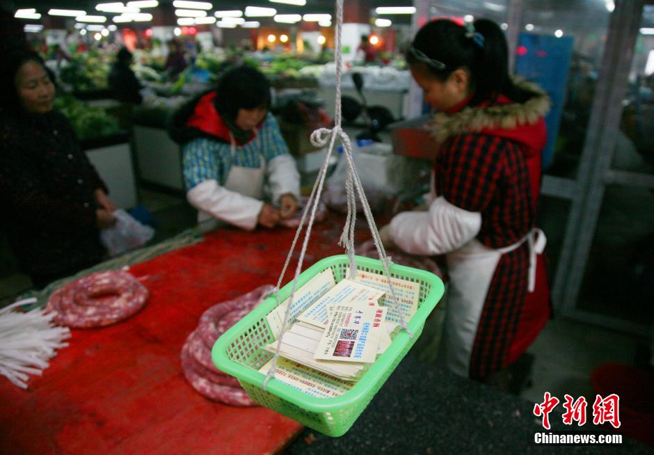 1月5日,在杭州闸弄口菜场内香肠老板于师傅向记者展示二维码名片。一边做香肠一边收钱既不方便也不卫生,于师傅的女儿便想到了时下流行的二维码支付。“我们毕竟现场加工的,纸钞细菌多,扫二维码让人家看起来也舒服!”记者了解到,于师傅的二维码支付摊位还颇受欢迎。今年元旦生意最好的一天,卖出3000斤的香肠。 中新社发 李晨韵 摄
