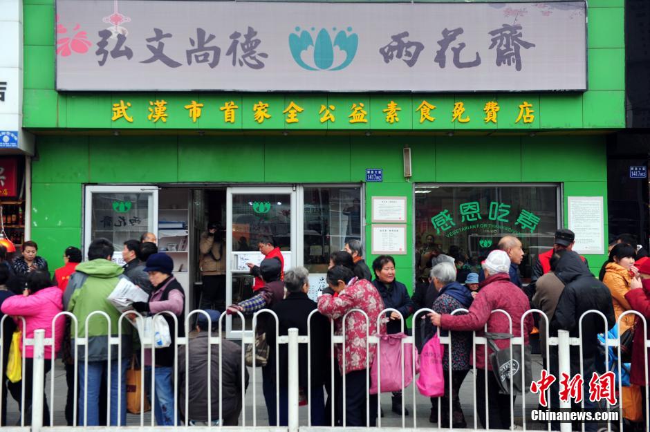 1月5日,一家公益性免费餐厅亮相武汉闹市。坐落在武汉汉口循礼门江汉北路与解放大道交会路口的免费餐厅名叫雨花斋,由社会爱心人士集资筹办,以提供素食为主。目的是通过免费供应餐食的形式,向公众传播“感恩”理念。图为免费素食馆外排起了长队。 中新社发 张畅 摄