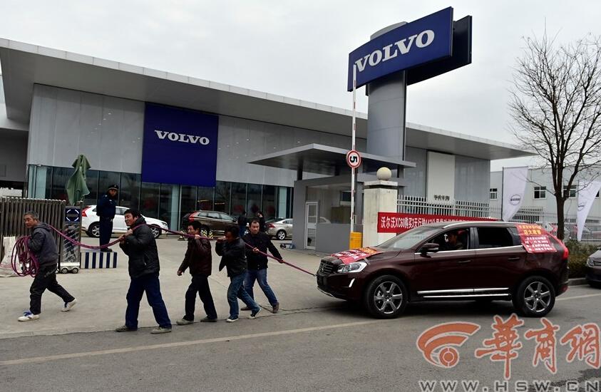 1月5日下午,在西安市浐灞汽车主题公园天润沃尔沃4S店门前,5名壮汉拽着一条粗绳,拖着一辆崭新的沃尔沃XC60越野车“游街”,这是怎么回事?车主王先生介绍,因为新买的车开回家第三天就出现漏油现象,与这家4S店协商多次没有结果,他才出此下策。图片来源:华商报