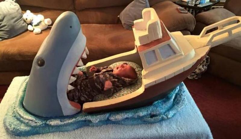 据英国《镜报》1月4日报道,英国男子约瑟夫·利吉内拉(Joseph Reginella)是斯皮尔伯格惊悚电影《大白鲨》的超级粉丝,日前他仿造电影场景,为只有两个月的小侄子迈克尔·梅兰赛奥(Michael Joseph Melaccio)献上了一张“大白鲨吞小船”造型的婴儿床作为礼物。图片来源: 国际在线