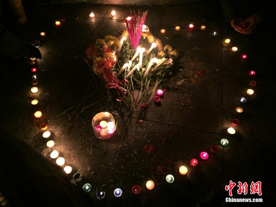 1月5日,哈尔滨数百名市民自发前往道外区景阳公园,用鲜花和蜡烛悼念在哈尔滨“1.2”火灾中逝去的消防战士。中新社发 魏来 摄