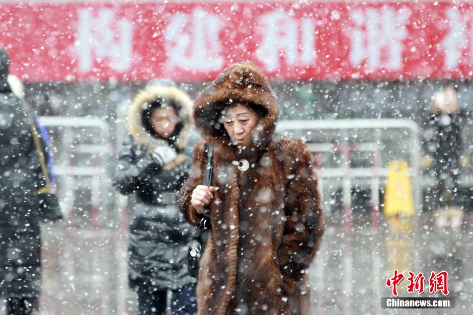 1月5日,辽宁省沈阳市中街附近,市民在雪中赶路。据辽宁省气象局官网消息,当日沈阳、辽阳、大连、鞍山、锦州等多地迎来降雪,这是2015年辽宁省的首场降雪。中新社发 孙昊声 摄