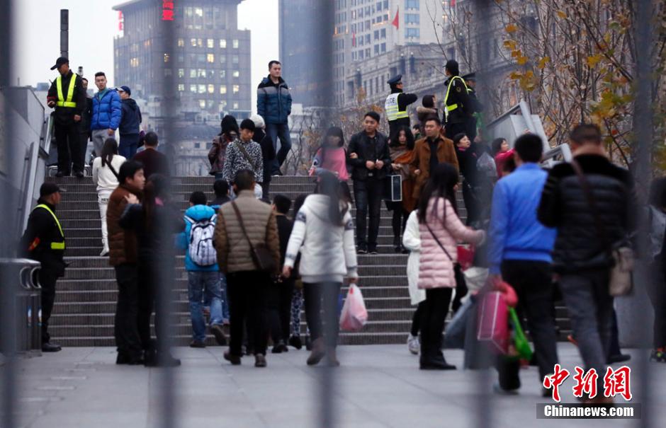2015年1月5日,上海外滩拥挤踩踏事件现场秩序井然,警方加强事发现场的安保工作。汤彦俊 摄