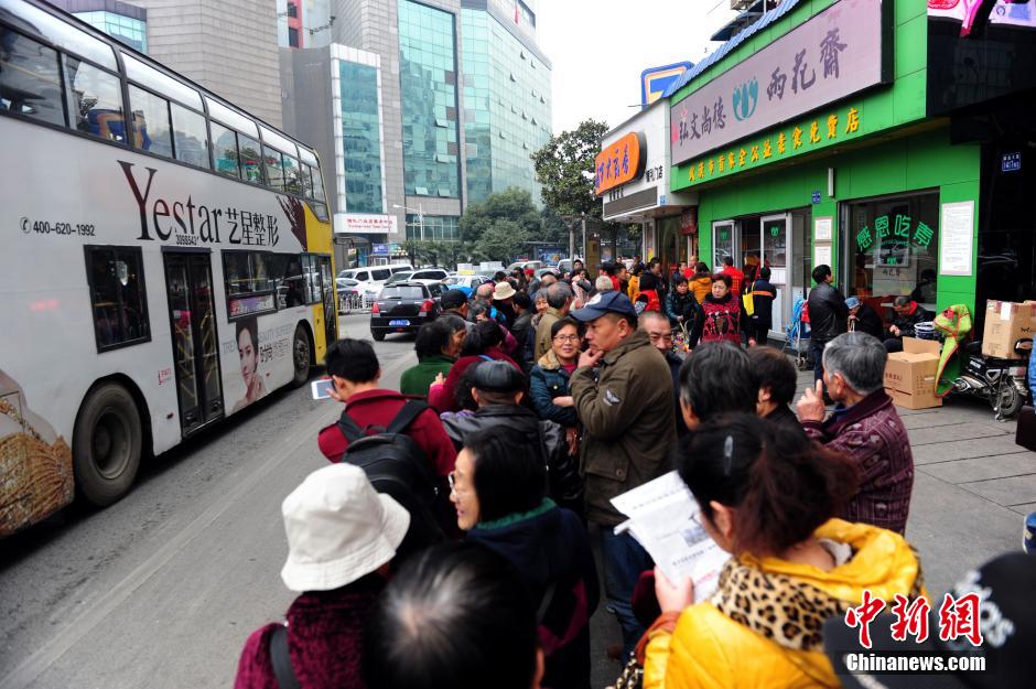 1月5日,一家公益性免费餐厅亮相武汉闹市。坐落在武汉汉口循礼门江汉北路与解放大道交会路口的免费餐厅名叫雨花斋,由社会爱心人士集资筹办,以提供素食为主。目的是通过免费供应餐食的形式,向公众传播“感恩”理念。图为免费素食馆外排起了长队。 中新社发 张畅 摄