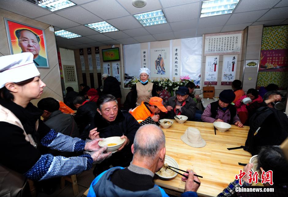 1月5日,一家公益性免费餐厅亮相武汉闹市。坐落在武汉汉口循礼门江汉北路与解放大道交会路口的免费餐厅名叫雨花斋,由社会爱心人士集资筹办,以提供素食为主。目的是通过免费供应餐食的形式,向公众传播“感恩”理念。图为免费餐厅坐满了前来就餐的市民。 中新社发 张畅 摄