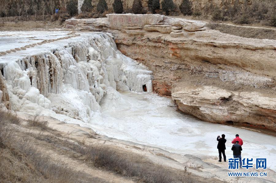 1月5日,游客在彭阳县境内的茹河瀑布观赏冰瀑景观。由于连日来的低温天气,位于宁夏回族自治区彭阳县境内的茹河瀑布形成了罕见的冰瀑景观,吸引周边地区的不少游客前往一饱眼福。 新华社记者彭昭之 摄