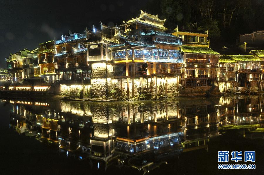 湘西凤凰古城沱江边灯光装扮下的特色民居(1月5日摄)。入夜,旅游胜地湖南湘西凤凰古城沱江沿岸灯火璀璨、霓虹闪烁,古城的夜景五彩斑斓,美不胜收。凤凰古城沱江风光带夜景亮化工程于2011年正式启用,总投资近1.6亿元。元旦过后,当地政府对亮化工程的LED灯进行维护,确保凤凰古城夜景灯光的正常使用,提升旅游形象。新华社记者 龙弘涛 摄